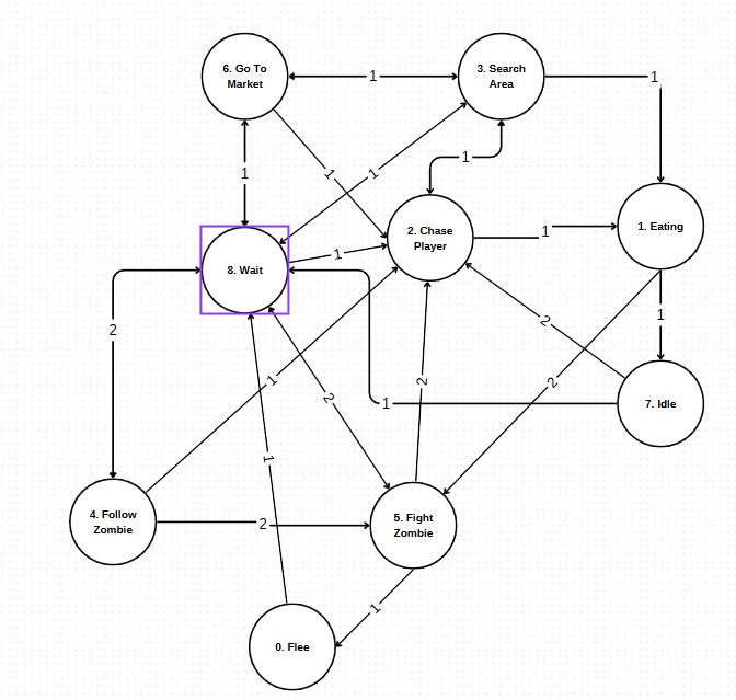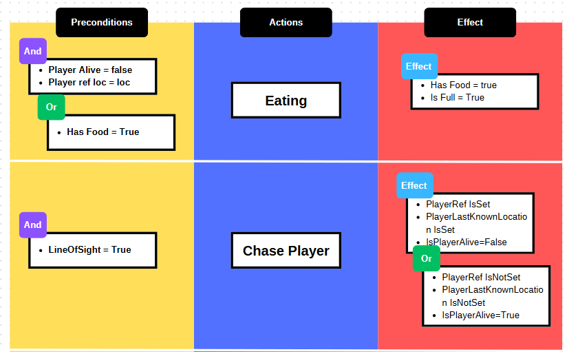 Goals: Of course these are objectives. Each goal is directly related to a desired value in the state data. For example, state data contains the following key value pair: {player alive: true}. One of the NPCs goals is to eliminate the player so the desired state would be {player alive: false}. Multiple goals can exist at the same time so it’s important to have priority defined for the goals.